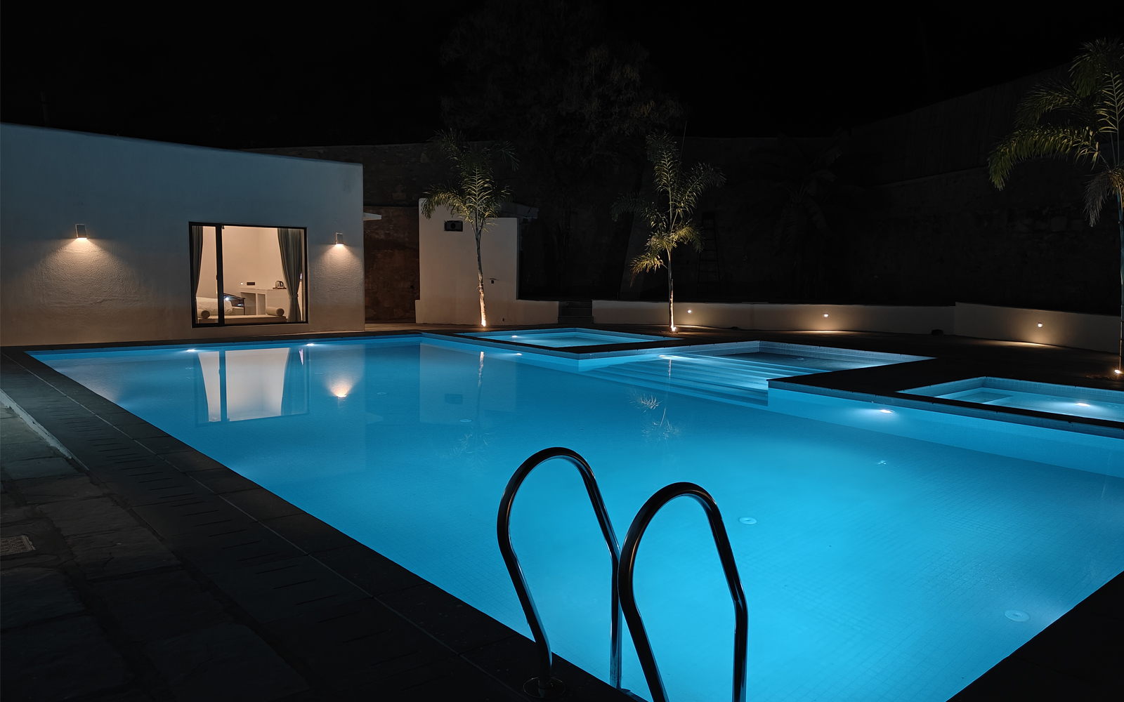 The whitewashed interiors, paired with exquisite furnishings, create an atmosphere of refined tranquility. A king-sized bed, adorned with luxurious white cotton linens, rests atop a solid stone base, while the Aagriya white marble bathroom adds an elegant touch of sophistication.