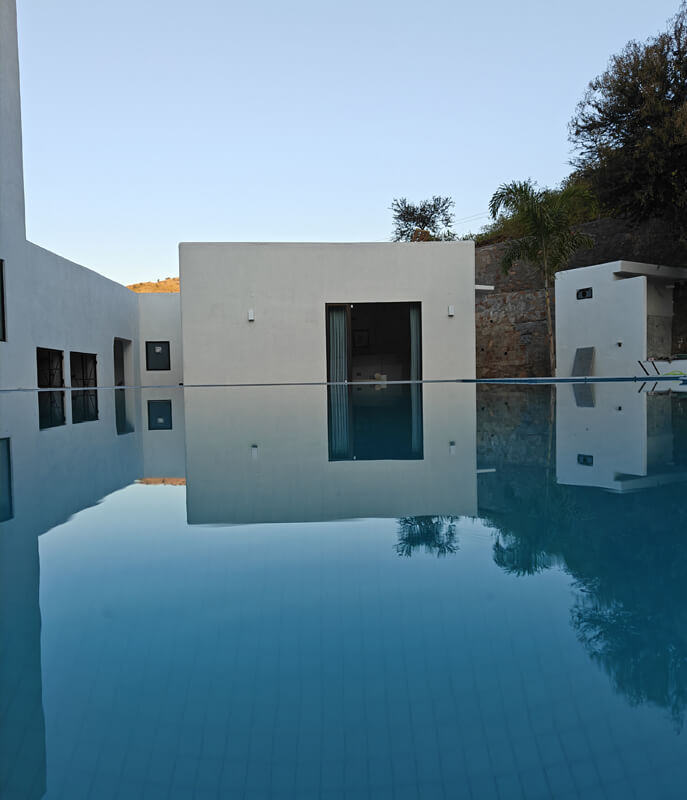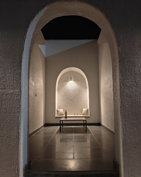 The place is an exquisite example of Cycladic architecture. Characterized by its pristine whitewashed walls and smooth, flowing lines, the architecture seems to rise organically from the land. The buildings are often minimalist in design, with rounded, sculptural shapes that mirror the undulating hills and the horizon itself. Square windows and doors, painted in bold dark brown, stand out against the stark white, enhancing the contrast between the built environment and the intense blue of the sky.